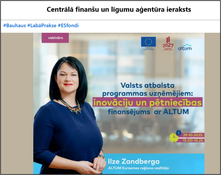 On 29 October 2025, Monta Anšica, a doctoral student of the National Research Programme at Ventspils University of Applied Sciences, participated in the informative seminar “Good Practice in the Implementation of EU-Funded Projects” organised by the Central Finance and Contracting Agency (CFLA). The participation took place within the framework of the National Research Programme project “Development of Evidence-Based Solutions for the Effective Improvement of Adult Professional Competence and the Evaluation of the Transfer of Its Results into Practice in Latvia” (VPP-IZM-Izglītība-2023/4-0001).