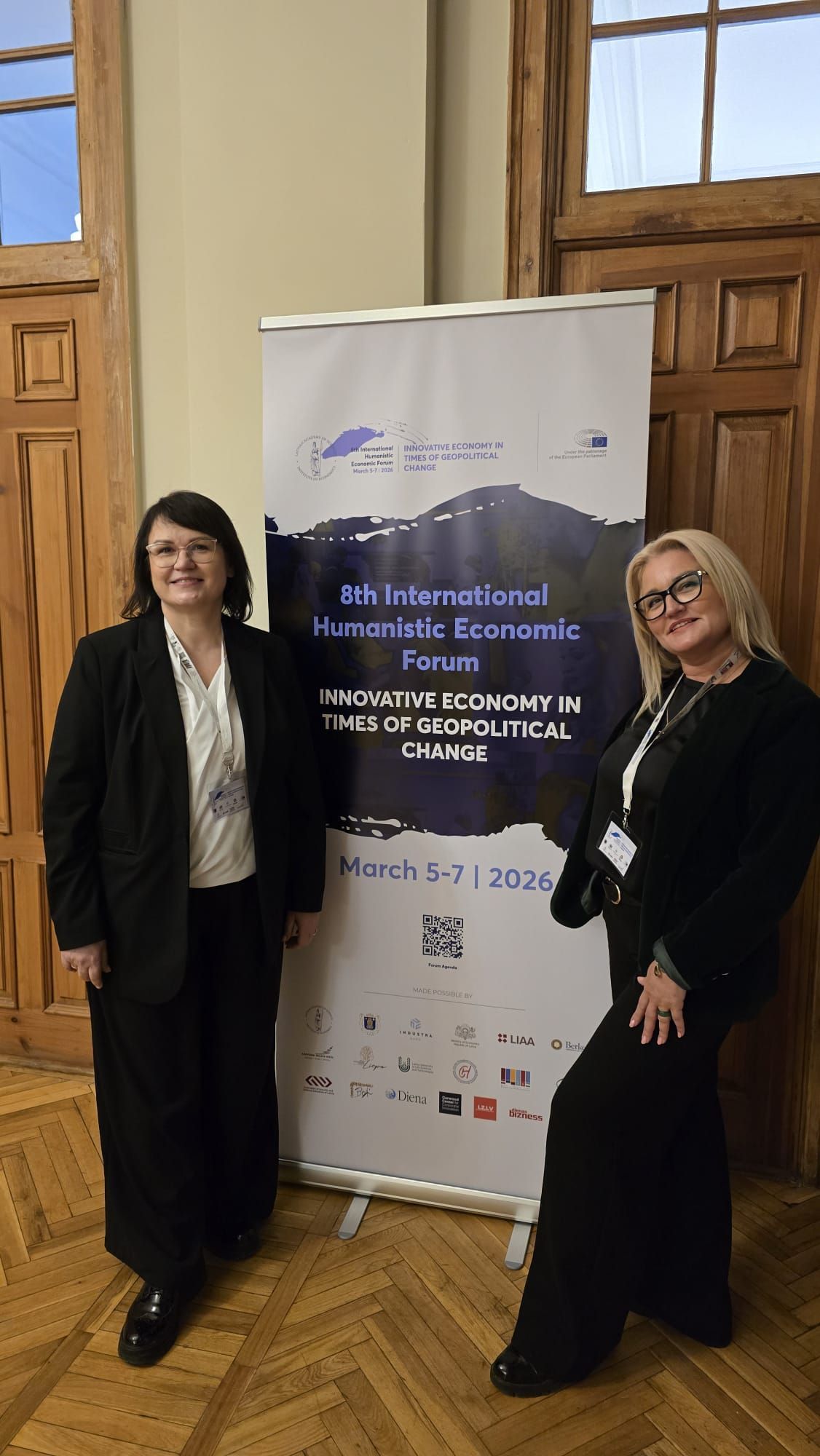 On March 5–7, 2026, the Latvian Academy of Sciences hosted the 8th International Forum of Humanistic Economics “Innovative Economy in a Time of Geopolitical Change”, dedicated to the 80th anniversary of the Latvian Academy of Sciences. Researchers from Ventspils University of Applied Sciences, Professor Una Libkovska and doctoral student Monta Anšica, participated in the forum, presenting research findings on the importance and development of management competences as a strategic investment in the development of organizations operating in knowledge-intensive sectors and promoting sustainable development, within the framework of the State Research Programme project “Elaboration of evidence-based solutions for effective professional competence development of adults and assessment of the transfer of its results into practice in Latvia” (VPP-IZM-Izglitiba-2023/4-0001).