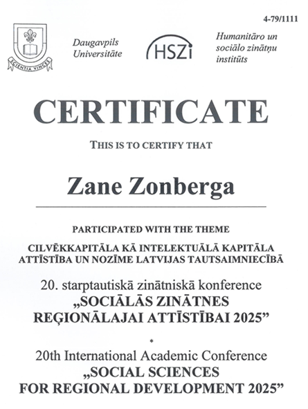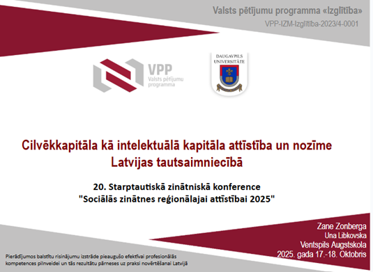 On October 17-18, 2025, the researchers of the National Research Programme project "Development of evidence-based solutions for the effective improvement of professional competence of adults and assessment of the transfer of its results to practice in Latvia", professor Una Libkovska and doctoral student Zane Zonberga participated in the international scientific conference "Social sciences for regional development 2025", which took place at the Institute of Humanities and Social Sciences of Daugavpils University. The conference presented the research implemented within the framework of the project, looking at the effectiveness of adult professional competence development, human capital development, skills transfer tools in practice, as well as the importance of regional cooperation for the sustainable development of education and employment.